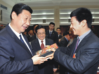 2011年3月8日下午,諸暨長城國際影視網(wǎng)游動漫創(chuàng)意園公司副董事長趙林中向習(xí)主席送上公司參與投資的長城影視集團(tuán)拍攝制作的《五星紅旗迎風(fēng)飄揚(yáng)》和《東方紅》光盤